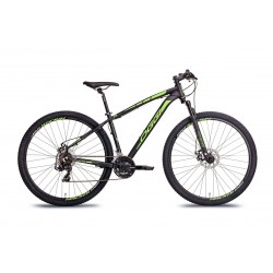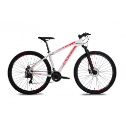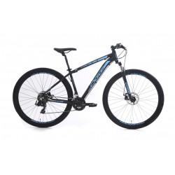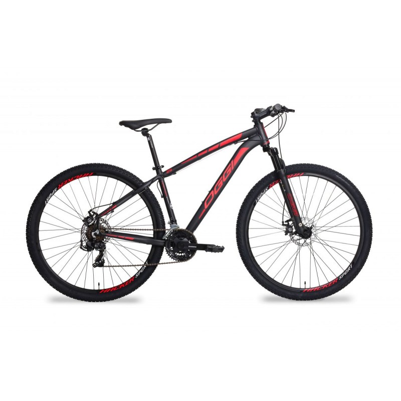 A Hacker Sport vem com grupo Shimano Tourney de 21 velocidades e ainda conta com suspensão dianteira Oggi, com 100mm de curso.