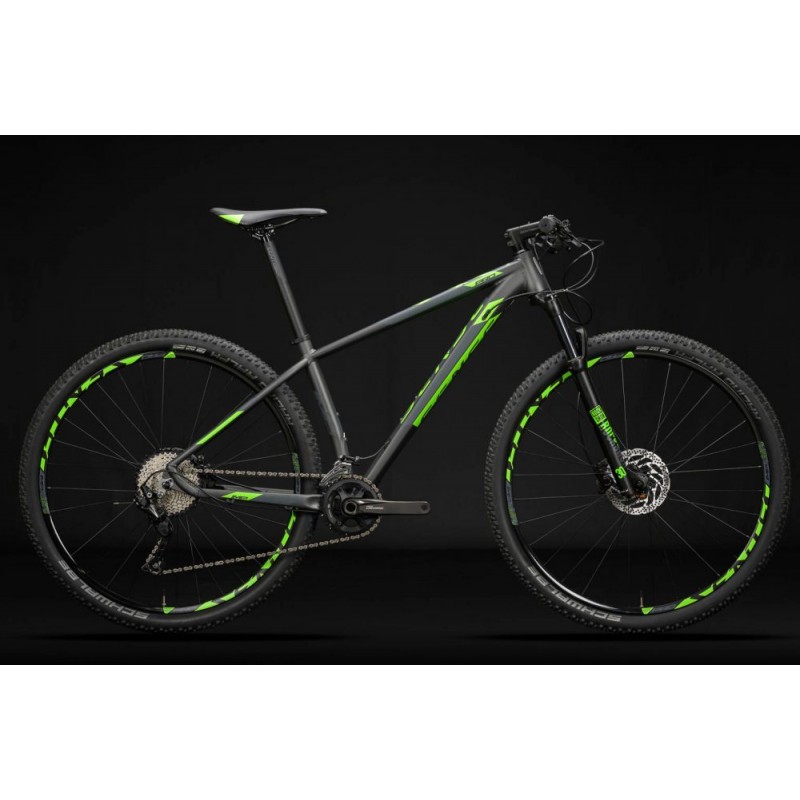 Uma bike equipada com o grupo Shimano Deore 2×10, com a suspensão Rock Shox 30 Silver TK Air 100mm, com trava remota, componentes Sentec RS2 e freios a disco Shimano MT4000.